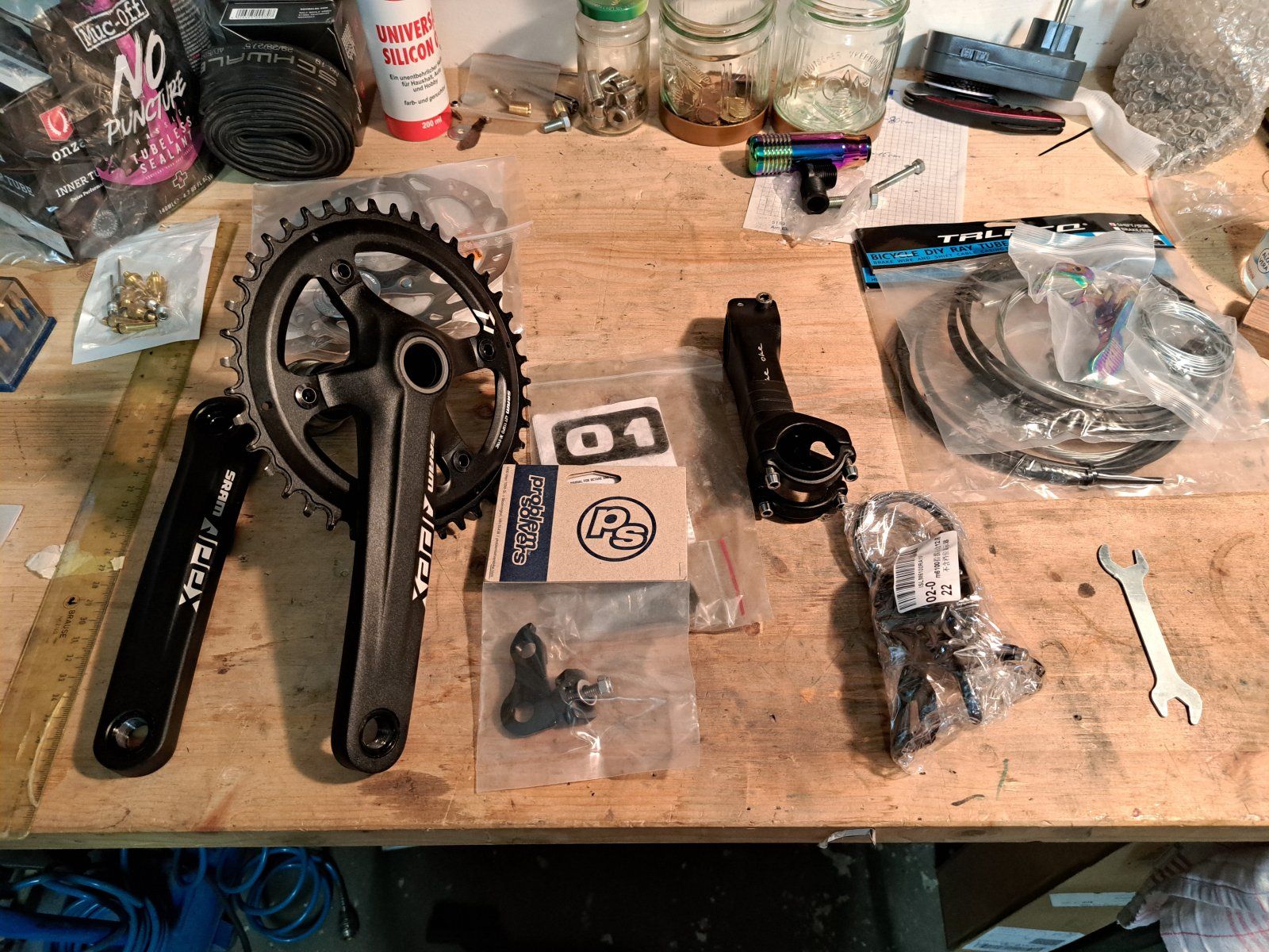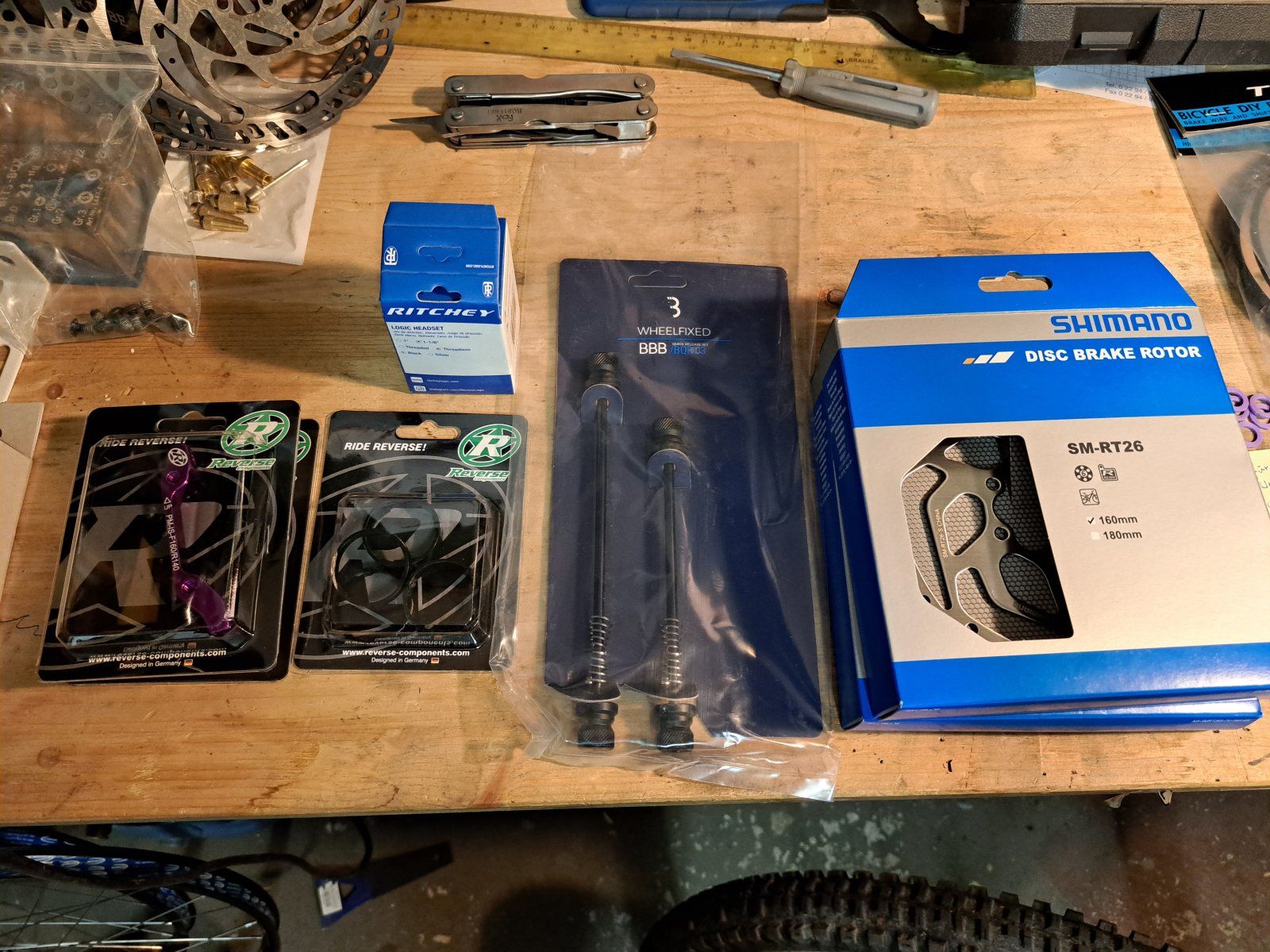 Erster Haufen an Kram ist so eben gelandet. Dann kann ich zumindest die hintere Bremse, Scheiben und so weiter mal fertig machen.