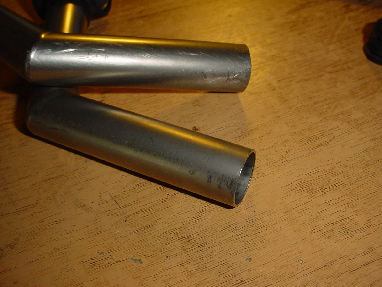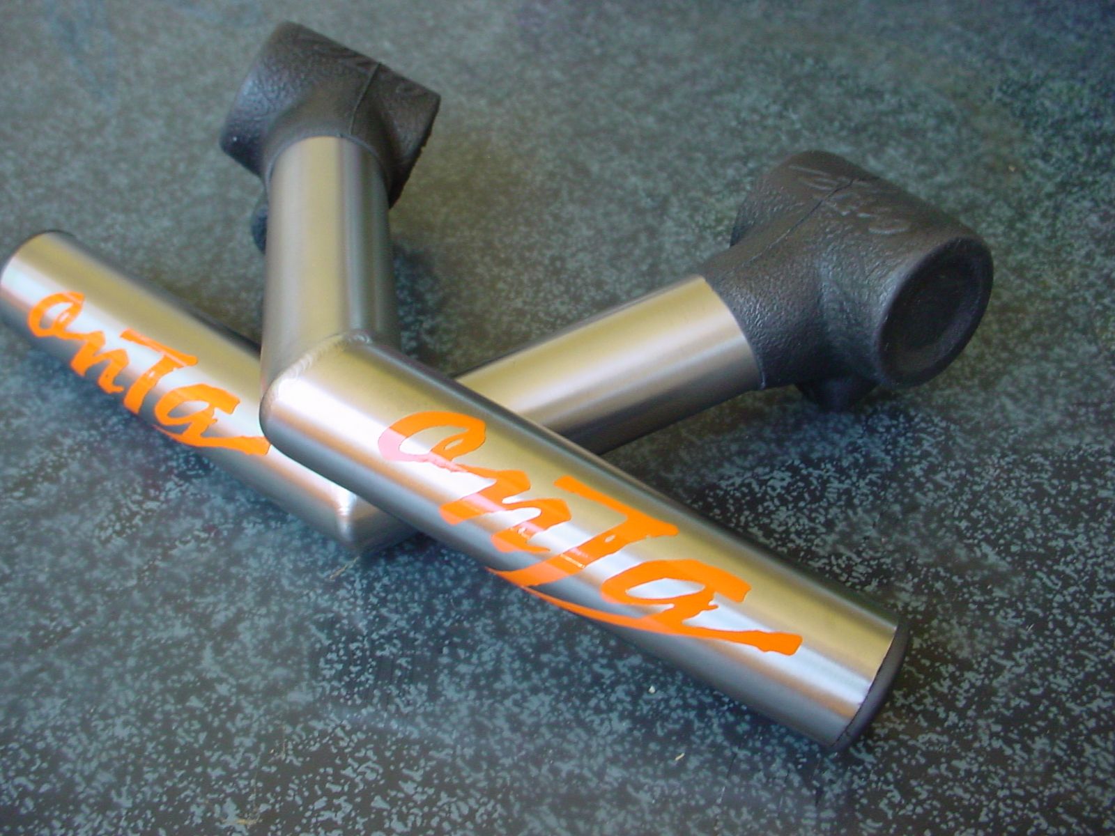 Hatte vor ein paar Monaten für 50 Euro ein paar ziemlich zerkratzte und abgerockte Onza Ti Bar Ends der ersten Generation gekauft. Also alte Decals runter, Schleif-Vlies, Dremel und 1000er Schmiergel raus und ran ans Werk. Neue Decals in GB bestellt (beste Qualität bei diesem Seller) und die Gummi-Überzieher der 15 Euro teuren 1991er Onza Cromo Bar Ends auf die Ti's verpflanzt.