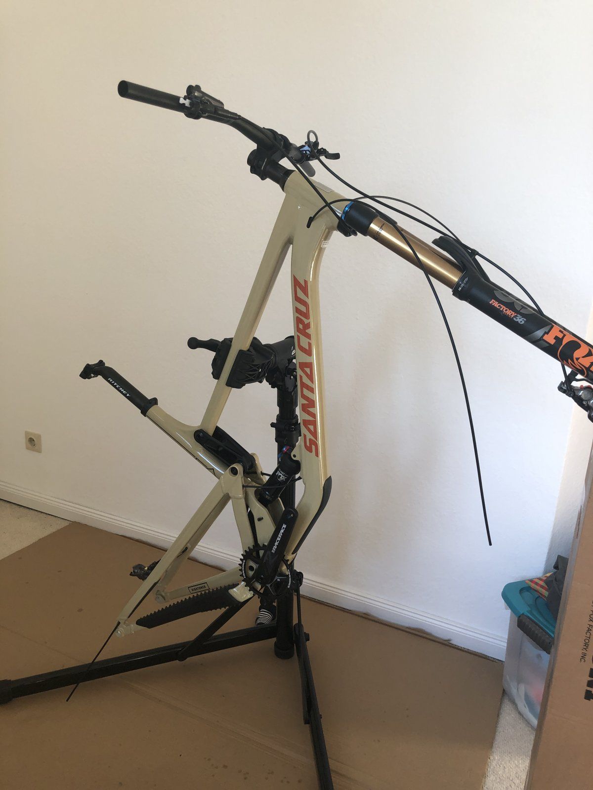 Für das Entlüften musste ich dann etwas kreativ sein. Keine Ahnung ob es unbedingt notwendig ist, aber ich wollte, dass die Entlüftungsschraube am Griff der höchste Punkt im System ist. Also Rahmen wieder hochkant gedreht, die Leitung unter der Gabelkrone durchgefädelt und Griff montiert. Anschließend Trichter rein und das übliche Spiel. Natürlich hatte ich zum Entlüften/Befüllen auch die gefüllte Spritze am Bremssattel montiert aber davon habe ich offenbar kein Foto gemacht.