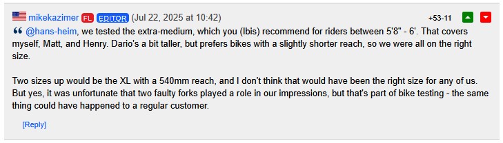 )Irgendwie kommt das so rüber als wäre Pinkbike mit Ibis auf Kriegsfuß… (ohne den Test der AluVersion gelesen zu haben)Im Zuge des AF releases hatte sich Hans Heim von Ibis übrigens noch bei Pinkbike zu Wort gemeldet bzgl. der Gabelperformance während des Ripmo-Tests.