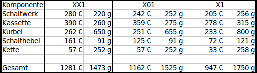 Wollt ihr wirklich die X1 in Betracht ziehen? Wenn ich den Artikel von Stefanus ansehe, dann kommt sie mir gar nicht so attraktiv vor im Vergleich zur X01, denn viele Komponenten sind massiv schwerer (Kurbel), oder verschleißanfälliger (sehr deutlich bei der Kette, in Maßen beim Schaltwerk), oder beides (Kassette). Z.B. die Kurbel ist 30 EUR günstiger aber volle 150g schwerer. Diese 150g woanders einzuspaaren kommt wesentlich teurer als 30 EUR. Dass die Kette qualitativ eher mäßig ist berichtet sogar der Typ von SRAM laut obigem Artikel. Wieviel weniger die Kassette hält kann eigentlich nur die Erfahrung zeigen. Da die X1-Kassette aber nur oberflächengehärtet statt durchgehärtet ist kann ich mir gut vorstellen, dass man mit der X01 bei den Betriebskosten günstiger und leichter davonkommt. Eigentlich macht nur der Schalthebel Sinn, und auch nur dann, wenn man auf die Verstellung verzichten kann.