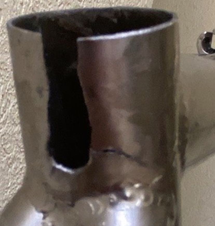„Am Sitzrohr ist ganz oben ein kleiner Riss (siehe Foto). Da hat ein Spezialist eine zu schmale Sattelstange mit aller aller Gewalt festspannen wollen. Zum Glück nur sehr minimal. Hinter einer Sattelklemme irrelevant und nicht sichtbar.“