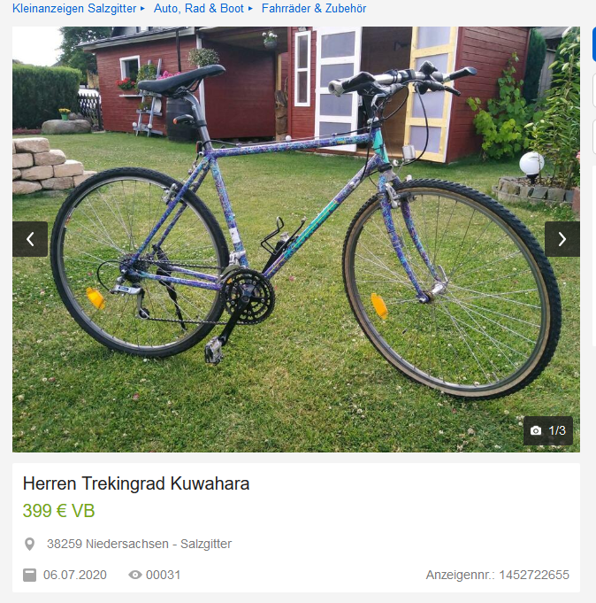 Die häßlichen Dinger haben doch alle 24" oder gar nur 20" Räder, so lang/hoch erscheint mir die Gabel nicht (die weggebrochenen Bremssockel waren auch deutlich höher, also für 26" Räder).Wie soll das passen, es sei denn man lässt sie oben 25cm aus der Brücke rausschauen? Ich habe das "schreckliche Rad" übrigens genau deshalb gepostet, damit man sieht, was aus dem Steuerrohrwinkel wird - da muss man das Lenken 10m vor der Kurve einleiten.