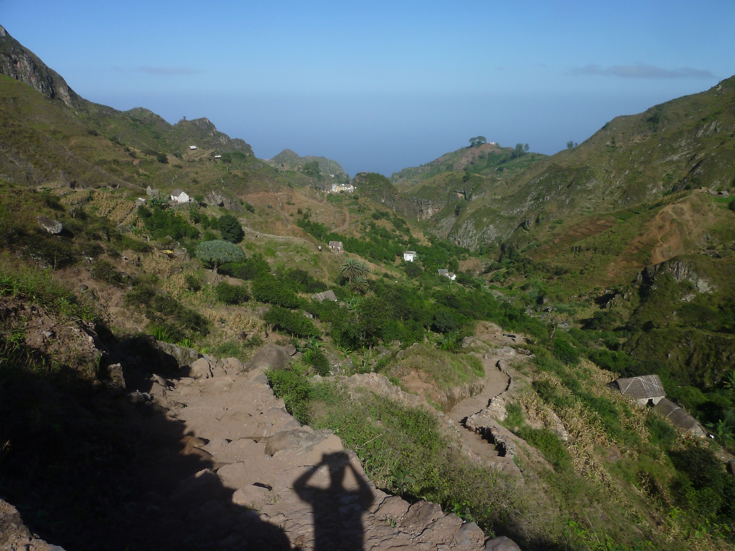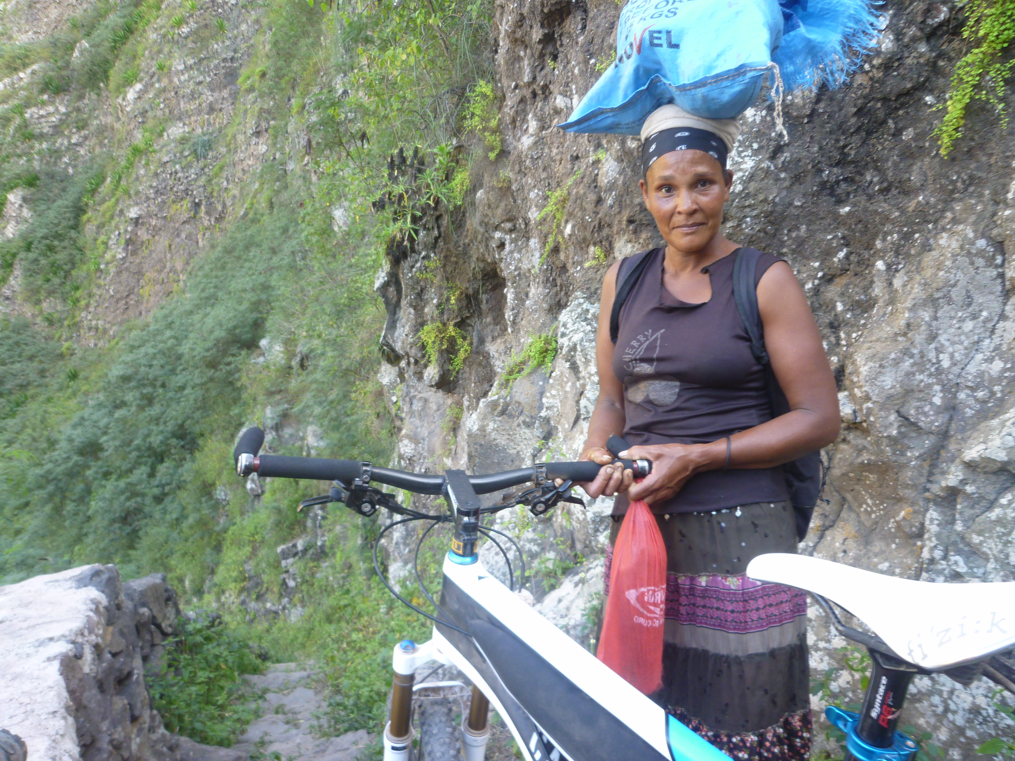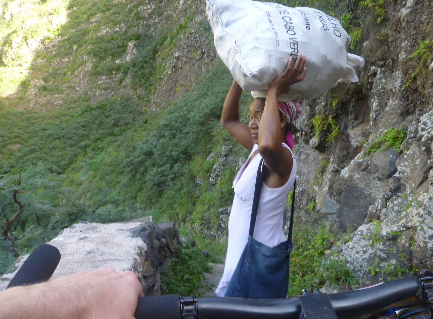 Gegenverkehr, diese Kapverdenlady trägt in etwa das Gewicht von Specki auf dem Kopf, sie hat noch sechshundert Hömes vor sich. Und während wir und noch unterhalten...