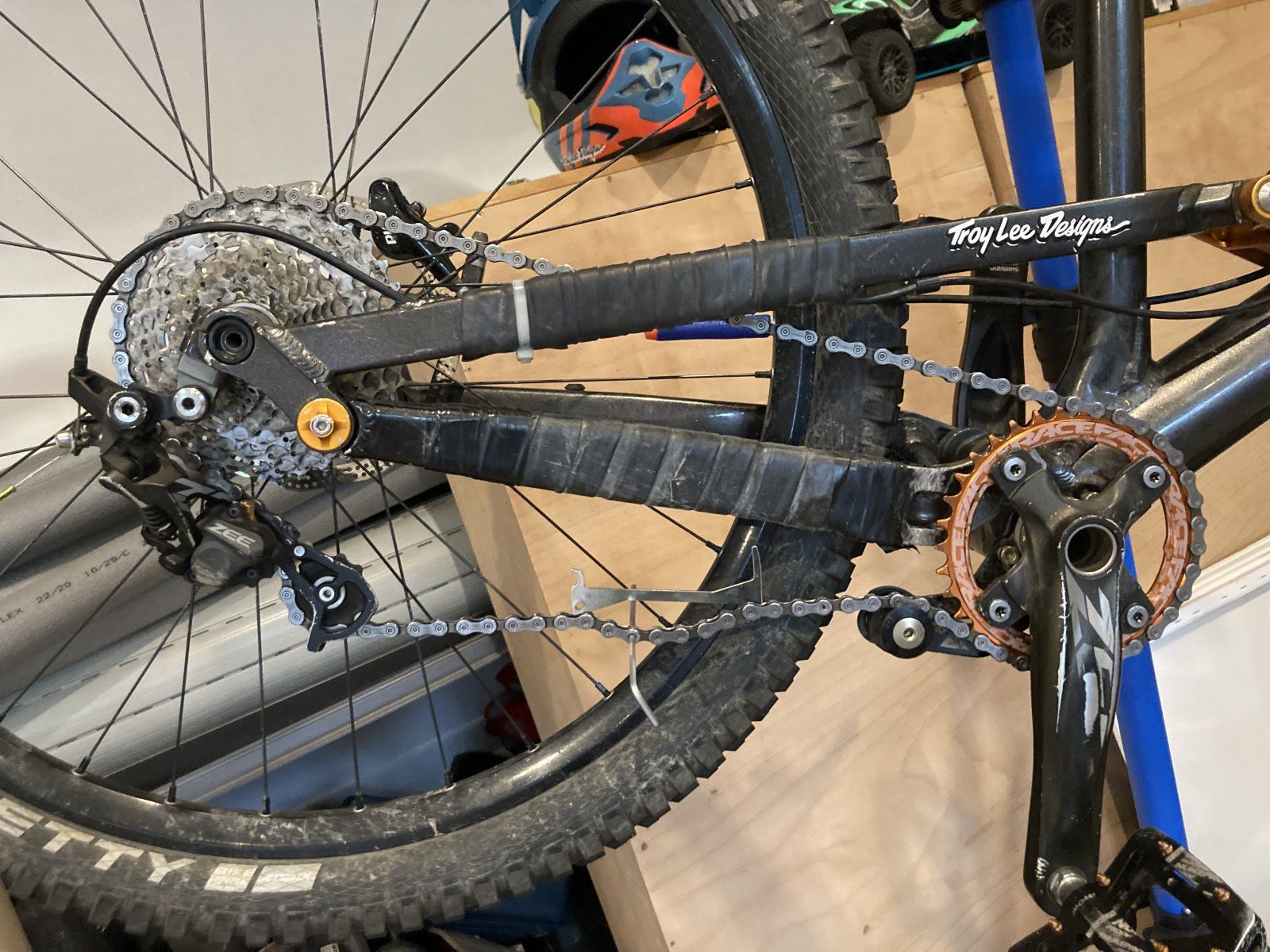 Neues Kettenblatt ist montiert. Die Kette ist, mit den zwei Zähnen weniger als beim alten Kettenblatt, definitiv zu lang. (Vorher 36T, jetzt 34T).