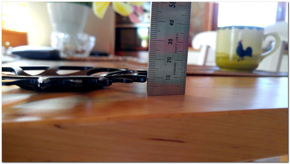 Dazu den geraden Gegenstand fest an das Kettenblatt seitlich drücken und diese Gerade nach hinten zur Kassette verlängern. Die Gerade sollte am mittleren Ritzel der Kassette enden. Also quasi exakt gerade nach hinten vom Kettenblatt sollte das mittlere Kb getroffen werden, dann passt die Kettenlinie.