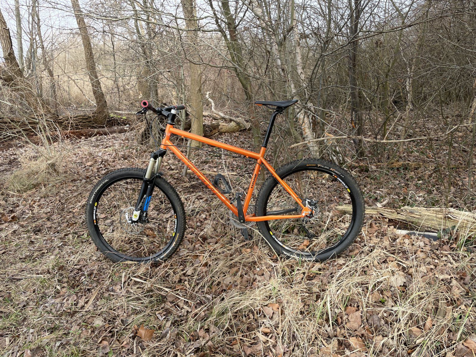 Dadurch, dass der Rahmen so ein langes Steuerrohr hat, habe ich auch nur eine begrenzte Auswahl an Federgabel, und auch nur eine Stargabel mit 435 mm.