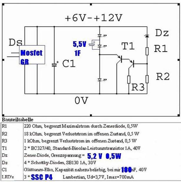 2. Habe da auch einen 5.5 V/1 F Gold Cap drinnen, aber das ist nach kürzester Zeit nur mehr ein Positionslicht. Spiele hier gerade mit 2.5 V/3,3 F herum und das kommt schon besser. Bei mehr vorhandenem Platz noch höheren Wert. Sind aber sehr kostenintensiv die Dinger :( und was lange nachleuchtet, zieht auch unerwünschtes Interesse an, ein Tradeoff, den sich jeder selber überlegen muss.