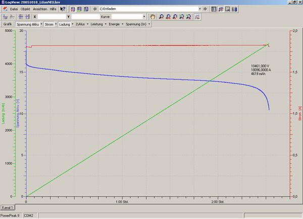 Und siehe da, laut Aufzeichnung hat der Pack 4619mAh bei einem konstanten Entladestrom von ca. 1,8A gebracht, was dem einer 20W Halo entspricht.