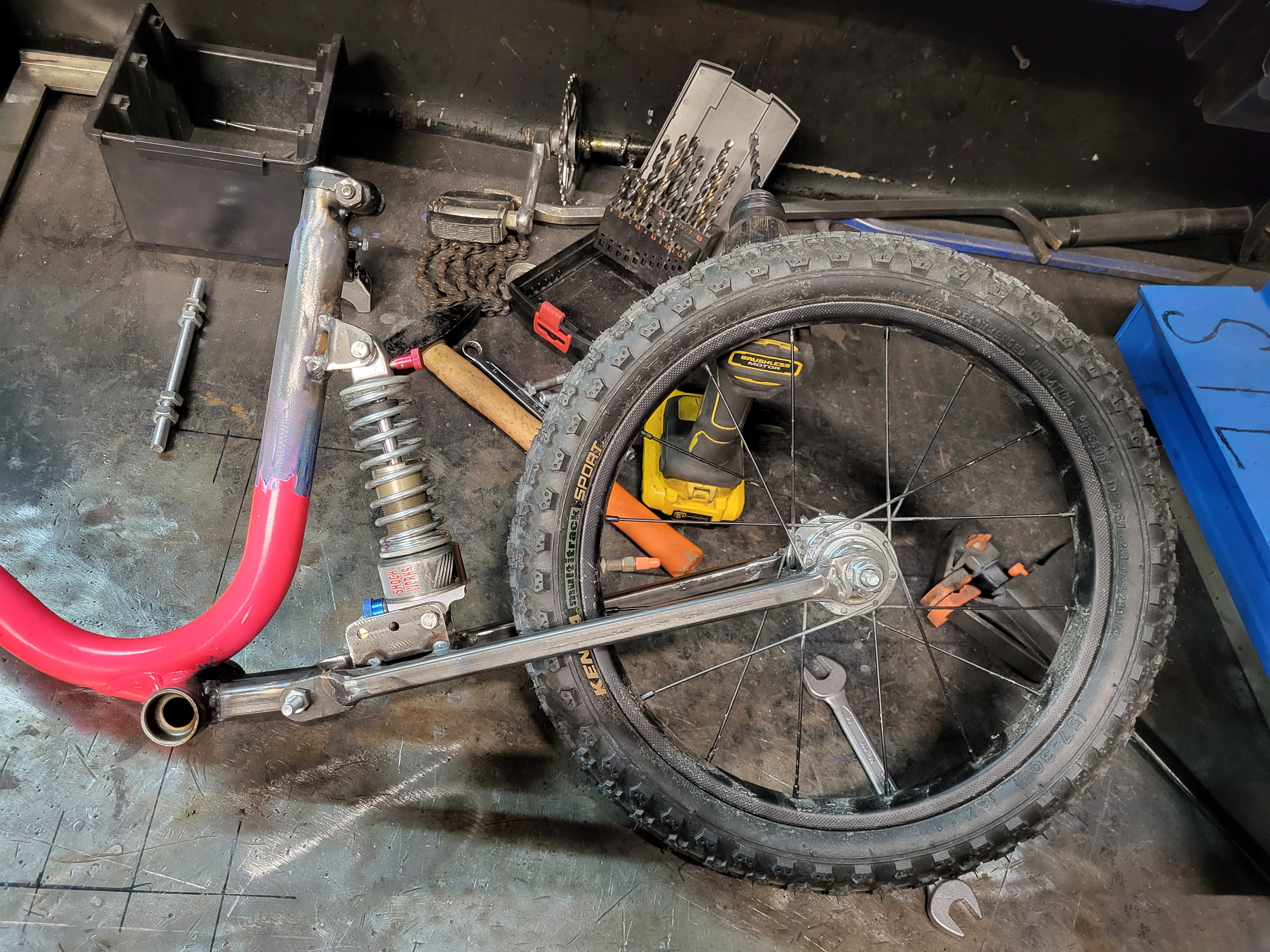 Feder stammte aus ein Hubwagen, aber war viel zu weich für 15kg Kind. Der ganze Schock wurde für ein längerer (190x45) getauscht, da die Pedale ständig an Wurzeln hängen geblieben waren, wenn es einfederte.Cool! Die Feder ist vermutlich nicht vom hiesigen Bikeshop, oder?