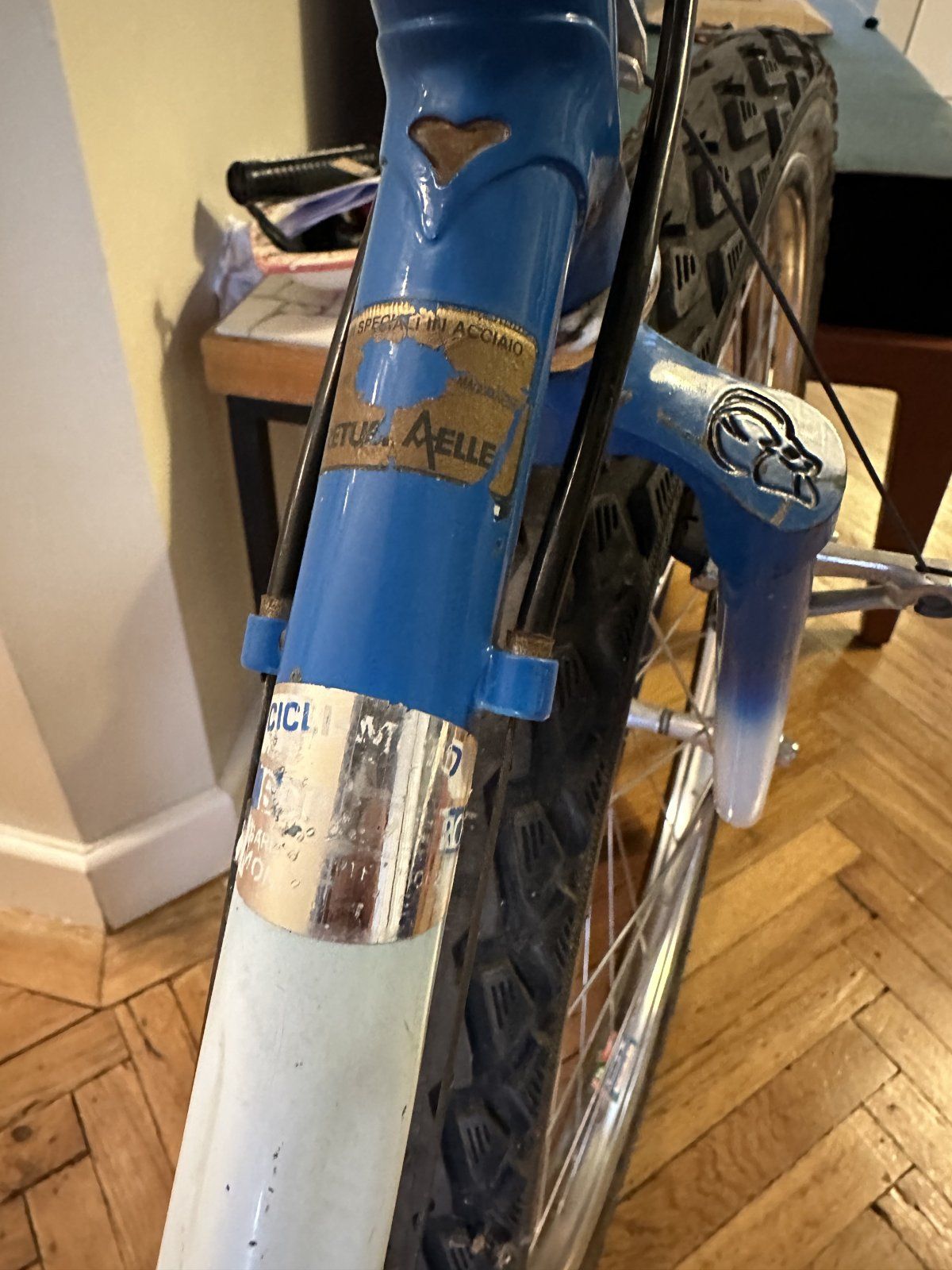 Leider ein sinnloser Kauf, weil zu klein. Sonst ja ganz ausgefallen mit Vierkant-Rohrsatz und netter Capriolo-Gabel.