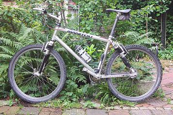 Steinschlag und Stöcke haben ihren Rest dazu beigetragen, das einstmals edle Finish in ein unansehliches Etwas zu verwandeln. Das beste kommt aber noch: Als ich vor Jahren mit dem ESK im Umland von Berlin unterwegs war, hat sich tückisch und voller Niedertracht ein ca. 30 cm langer Stock in meine Speichen katapultiert, ist dann durch die Aufwärtsbewegung an meinem Retro-95er XTR Schaltwerk vorbeigekommen, wobei bei dieser Gelegenheit die gesamte Schaltung samt nicht-auswechselbarem Schaltauge in tausend Stücke zerrissen wurde! Seitdem fahre ich Singlespeed ... ne Quatsch ... ein begnadeter Mechaniker aus Berlin (psst .. wird nicht verraten) hat das Schaltauge wieder zurechtgebogen und ein neues Gewinde geschnitten, seitdem geht’s wieder prächtig.