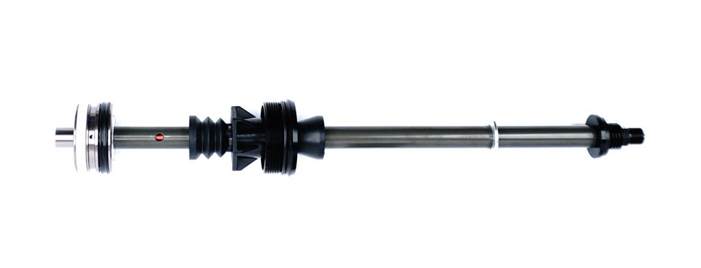 Das rot eloxierte Teil mit den beiden Dichtringen wird über die Druckstange (schaut unten aus der Gabel) betätigt. Dadurch öffnet man über die Querbohrung im Kolben die Negativairkammer. Gleichzeitig betätigt man ein konventionelles Ventil an der Positivluftkammer.