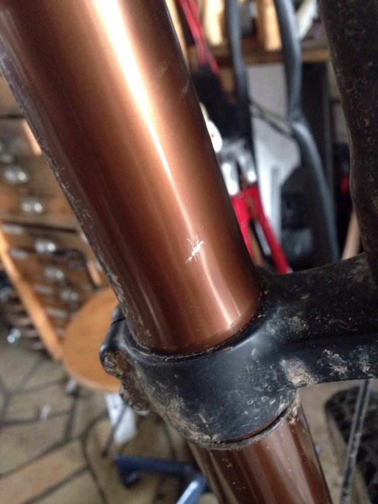 Die Gabel ist in den Rahmen eingeschlagen und hat sich zwischen den Kronen zwei mal eine unschöne Delle zugezogen.