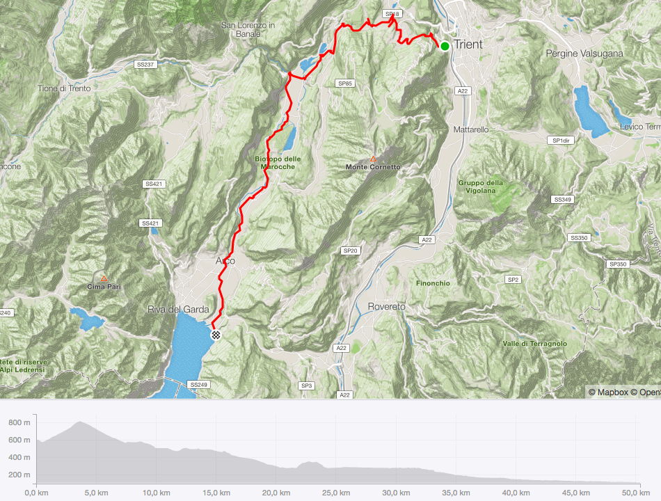 Bevor wir losfahren zurrt der Italiener noch die Vorderräder an der Reling fest und wir quetschen uns zu acht und das Gepäck in den kleinen Wagen. Zum Glück sind Alpen-Reiseradler meist mit wenig Gepäck unterwegs. Nach knapp 35 min ist es geschafft, wir sind in Rovereto und alle Räder sind noch auf dem Dach, scheinbar auch vollständig