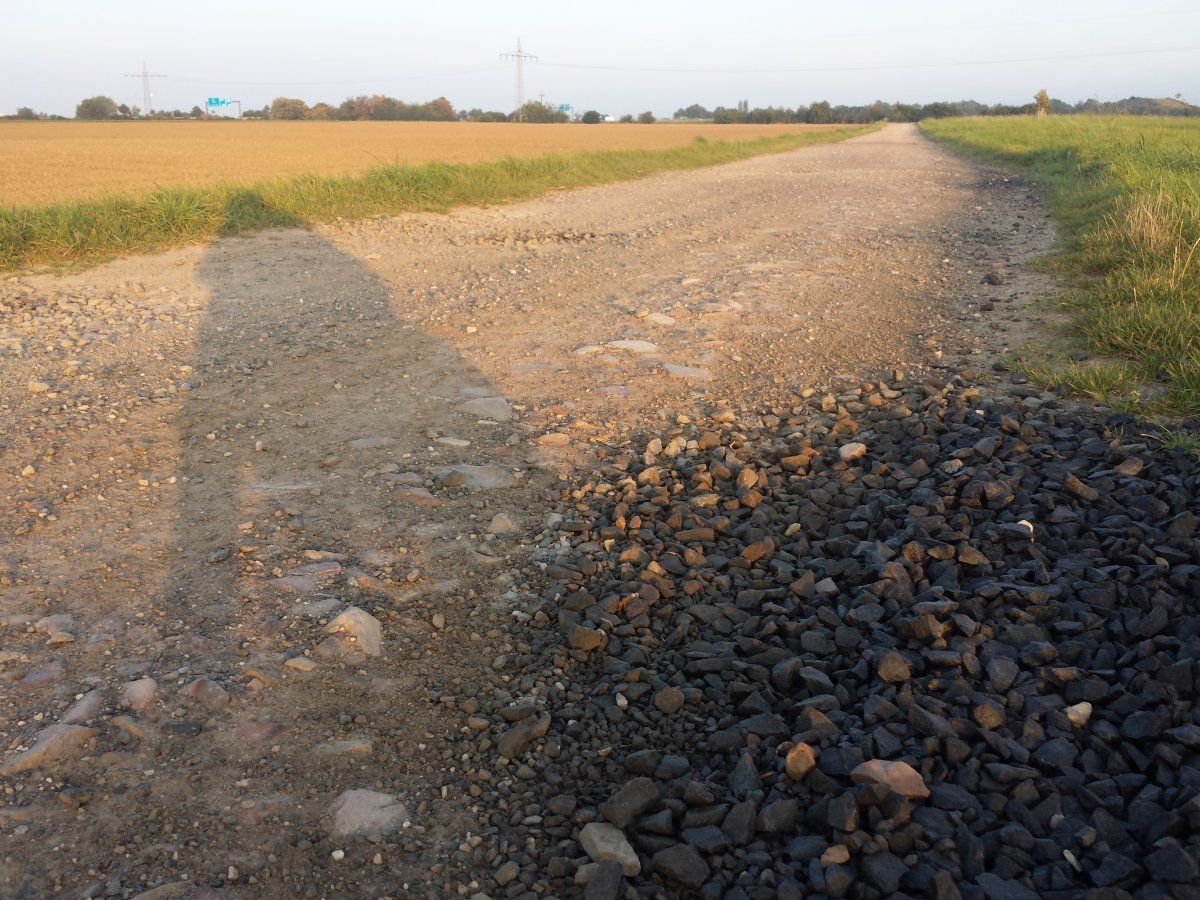 Auf dem Weg von Diedenbergen nach Massenheim würde ich am liebsten die historische "Steinerne Straße" (angefügte Karte blau) benutze, diese ist allerdings leider nicht mehr existent. Deswegen benutze ich die Umgehung über einen Feldweg (rot) und den "Diedenberger Weg" in Massenheim. Diese Route wird auch vom Radroutenplaner des Landes Hessen ausgegeben (als lokales Radnetz - Hauptstrecke, wie im PDF angegeben). Das Teilstück jenseits der A3 ist allerdings für Fahrräder mit normalen Reifen ebenfalls kaum passierbar. Bei meinem letzten Platten auf diesem Stück (im Sommer waren es drei Stück) habe ich habe zwei Aufnahmen des Zustands gemacht, die ich beigefügt habe.
