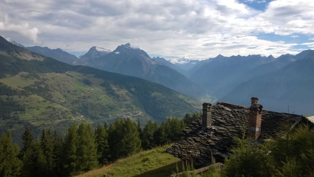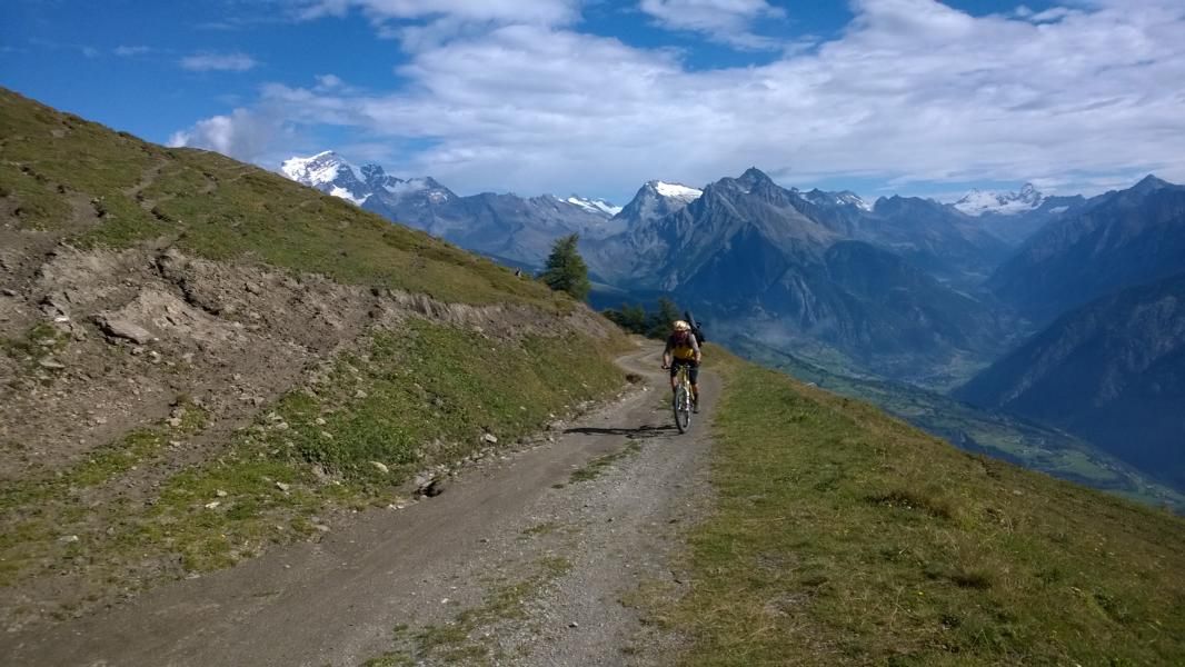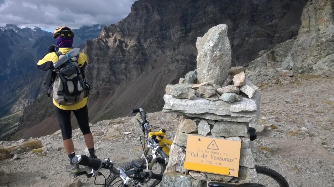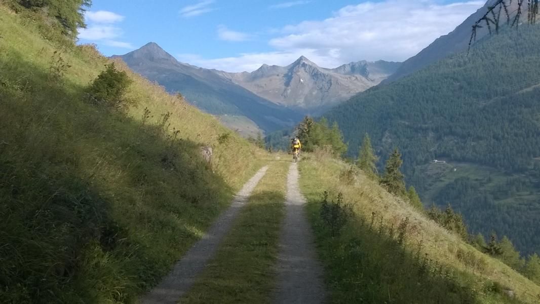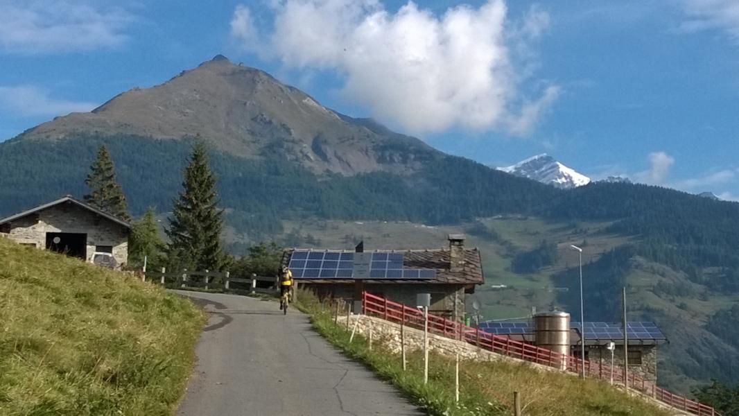 bald danach stoßen wir auf einen wunderbar fahrbaren waalweg und erreichen den weiler LIGNAN im valle st. BARTHELEMY. Nun könnten wir den tag nach 1.500 hm um 14 Uhr beenden. doch angesichts des guten wetters beschließen wir den nächsten übergang über die 3 pässe SALVE, CHALEBY und VESSONA NOCH ZU machen. alle drei sind zwischen 2.600-2.800 m hoch.