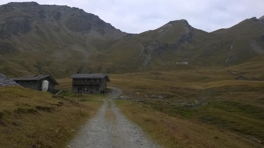 auch der heutige Tag wird lang und anstrengend. von valpelline geht es eine ewig lange, kehrenreiche almstraße 1000 hm hinauf zur alm champillon. der tag ist eher diesig. in dieser höhe macht sich die fehlende sonne in spürbar niedriger temperatur bemerkbar. die restlichen 400 hm wegen der steilheit der almstraße sind schiebestrecke.