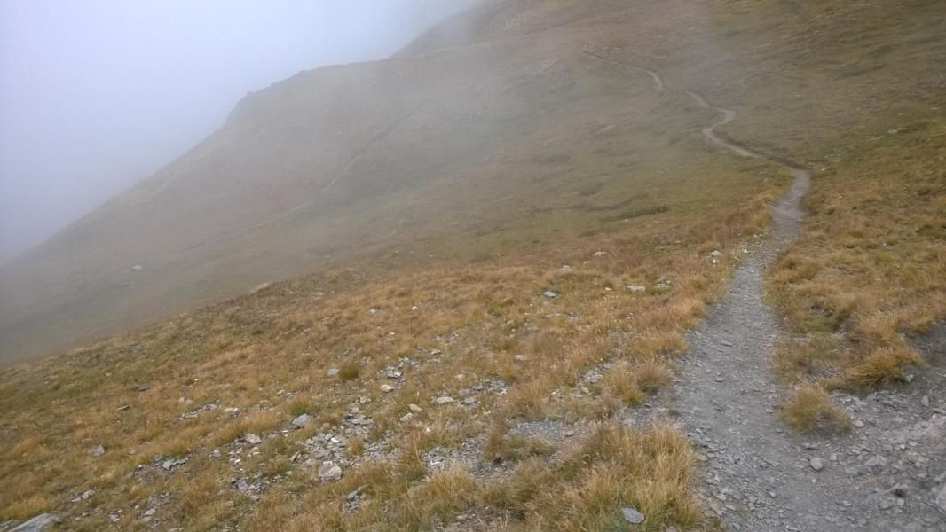 je höher wir kommen, desto windiger wird es. die letzten 200 hm dann offroad schieben bis zum passeinschnitt.(Schieben ca. 1 stunde) auch hier kalter wind. wir befinden uns praktisch südlich unseres übergangs vom 3. taG über den col de nana und sehen das BREITHORN, leider nebelverhangen.