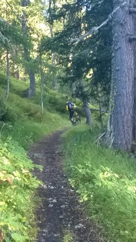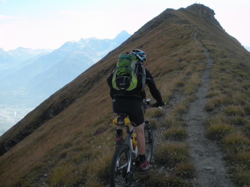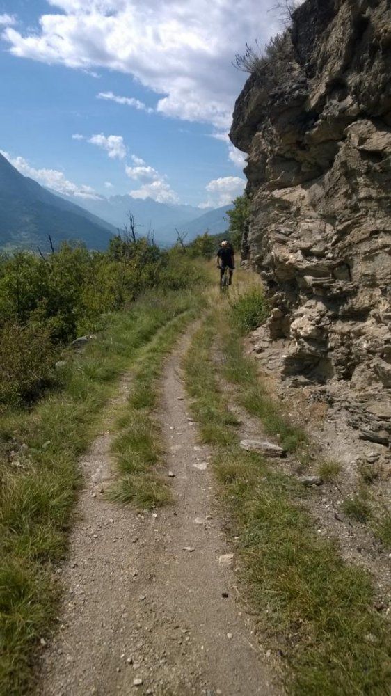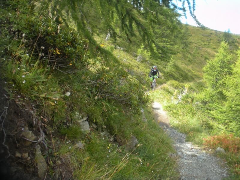 dabei geht es zunächst einige km auf TGC (tour grand combin) auf einer ehermaligen wasserleitungsstrecke in wunderbarem auf und ab. das ist mal eine erholung nach so vielen schiebe-km. auch die forststraße zum ehemal. FORT PIAN PUZ, 2.127 m. ist gut fahrbar. die ehemal.stellungen liegen in einer kaverne. unser weg geht darüber hinweg und führt dann in einer steilen rinne durch einen Lärchenwald (20 min schieben)