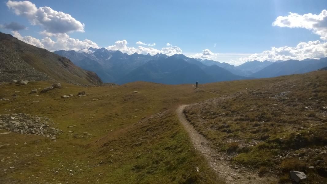 das folgende wegstück über den WEISMATTEN-pass ist auf der karte mal wieder schlecht dargestellt. auch achims beschreibung ist irreführend. ab ranzola nach süden auf dem WW 3a/3b, dann folgt ein gegenanstieg 200 hm an steilem hang, der fast steigartig in eine felsscharte führt, um ebenfalls schiebend bergab (ca.45 min) bis zur alm pra bianco, 2030 m auszulaufen.