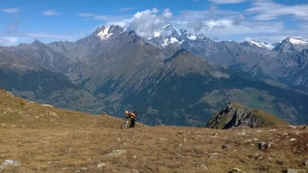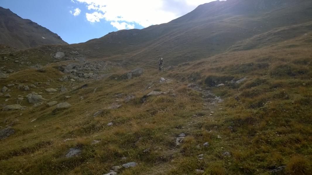 von dort beginnt die lange schiebestrecke über die 3 pässe. (ca. 2 h) Nur kleine teile sind fahrbar. Etwas frustrierend ist, dass man vom chaleby zunächst 200 hm absteigen muss, bevor es nochmals 300 hm über ein steiles geröllfeld bis zur passhöhe des VESSONA, 2.789 m geht. Kurz vor dem gipfel steht ein rudel von ca.20 Steinböcken, die uns bis auf 200 m heranlassen, ohne sich stören zu lassen. ein super erlebnis. Kalter wind und ein geiles panorama empfängt uns auf der gipfelscharte. es ist nun bereits 17 uhr.