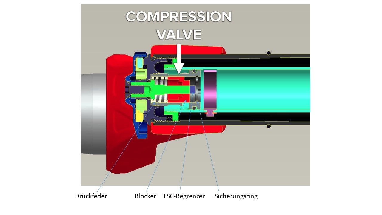 Die Druckstufe besteht unter anderem aus einem kleinen schwarzen Kunststoffzylinder, welcher seitlich eine Öffnung hat. Durch drehen des Zylinders wird die Größe der Öffnung beeinflusst...das ist die LSC.