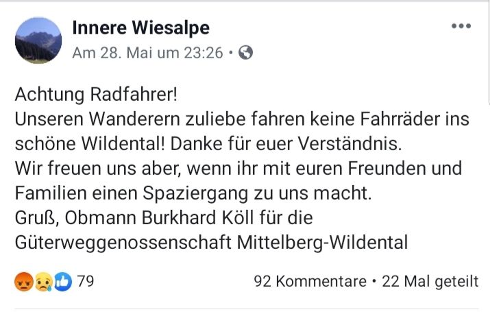 Ich krieg im Schnitt einmal in der Woche einen dummen Kommentar von Wanderern. Bin mir sicher das wäre viel besser, wenn noch mehr Radler unterwegs wären. Auch die ganzen neuen Schilder bilde ich mir nur ein. Schon klar.Ja, vielleicht.