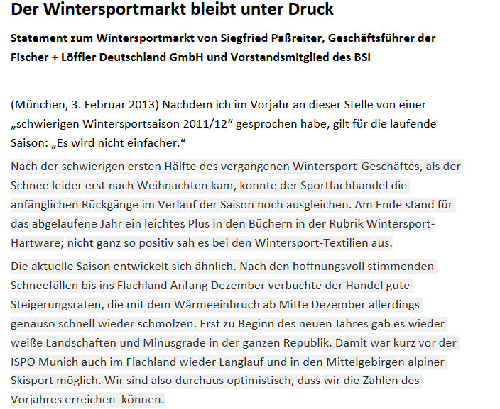 "Auch einige Hersteller stellen ihr Geschäftsmodell um. Amer Sports etwa kündigte an, sich künftig mehr auf die Bekleidung zu konzentrieren. „Amer Sports erwartet, dass das Geschäftsumfeld im Jahr 2013 herausfordernd bleibt“, sagt Michael Schineis, Wintersportchef des Unternehmens.