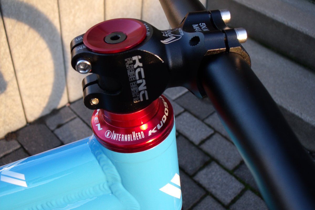 KCNC Vorbau und Lenker sind mit 145g und 89g schön leicht und auch in der 25,4mm Version von den Proportionen zum Bike passend, wie ich finde.