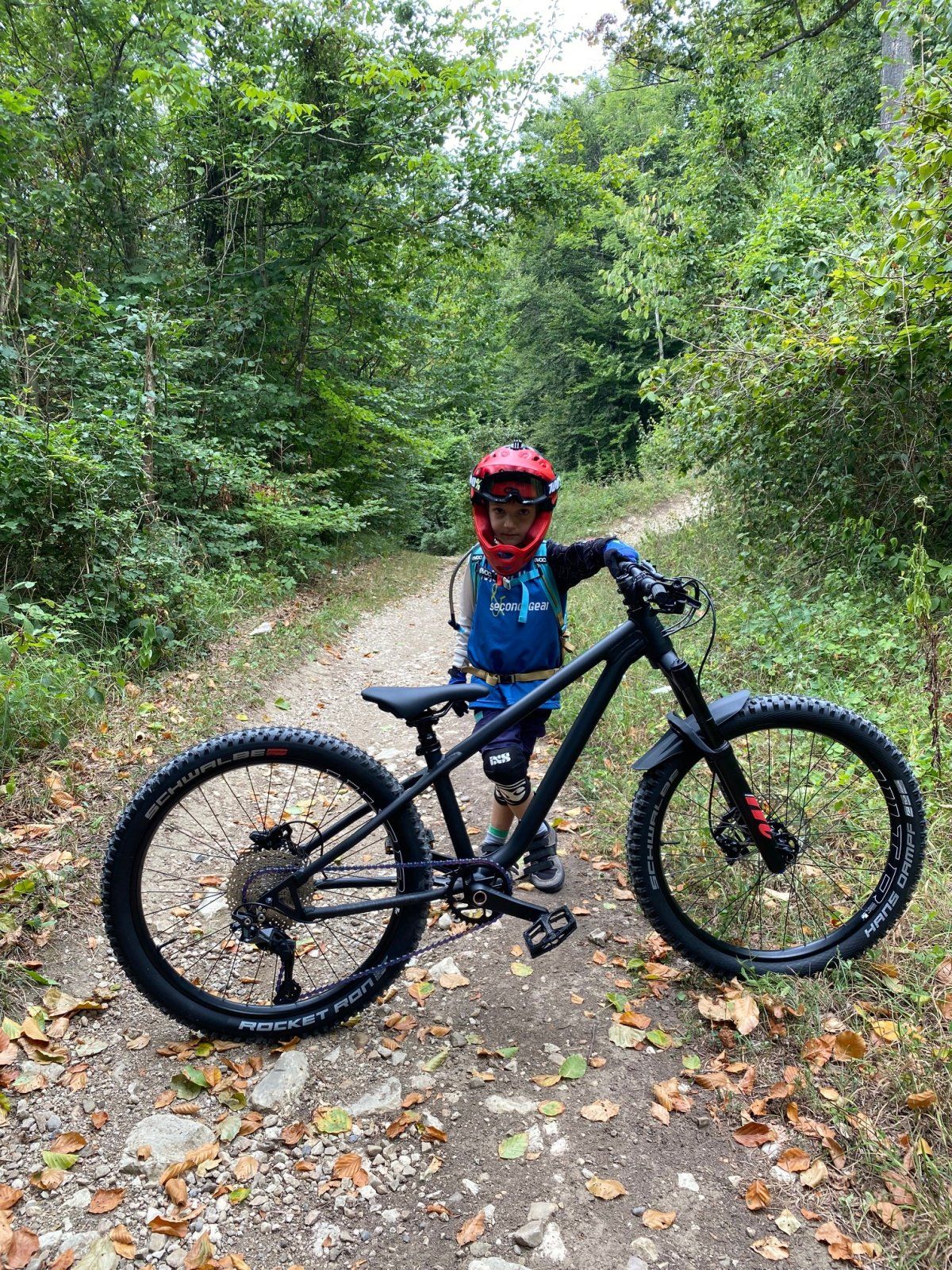 nach der ersten fahrt war es dann eigentlich schon klar dass es wohl ohne kubikes weitergeht. der kleine fühlte sich sehr wohl und kam mit allem gleich klar. die sattelstütze klappt auch bei seinen 20kg obwohl noch nicht notwendig da eh immer auf unterster position. bremsen haben deutlich mehr power natürlich als die felgenbremse vom 20" mit geringerer bedienkraft. was mich erstaunt hat ist dass er trotz dem noch grossen rahmen das vorderrad anheben kann bei einer stufe. dies sowie auf/absteigen war dann schlussendlich das kriterium ob nur noch das 24" gefahren wird oder nicht. untedessen ist er ein paar wochen damit unterwegs und macht eingetlich alles besser als mit dem 20". gerade die stabilität durch die geometrie macht es für ihn deutlich einfacher auf den trails, die bremsen helfen (hätte nicht gedacht dass da der unterschied so gross ist), federgabel funktioniert besser und er kommt mit der grösse sehr gut zurecht. klar kommt er nur mit einem fuss sitzend auf dem oberrohr auf den boden und muss die pedalstellung richtig haben um anzufahren drch die länge vom rad hat er aber einen deutlich besseres gleichgewicht mit dem rad.