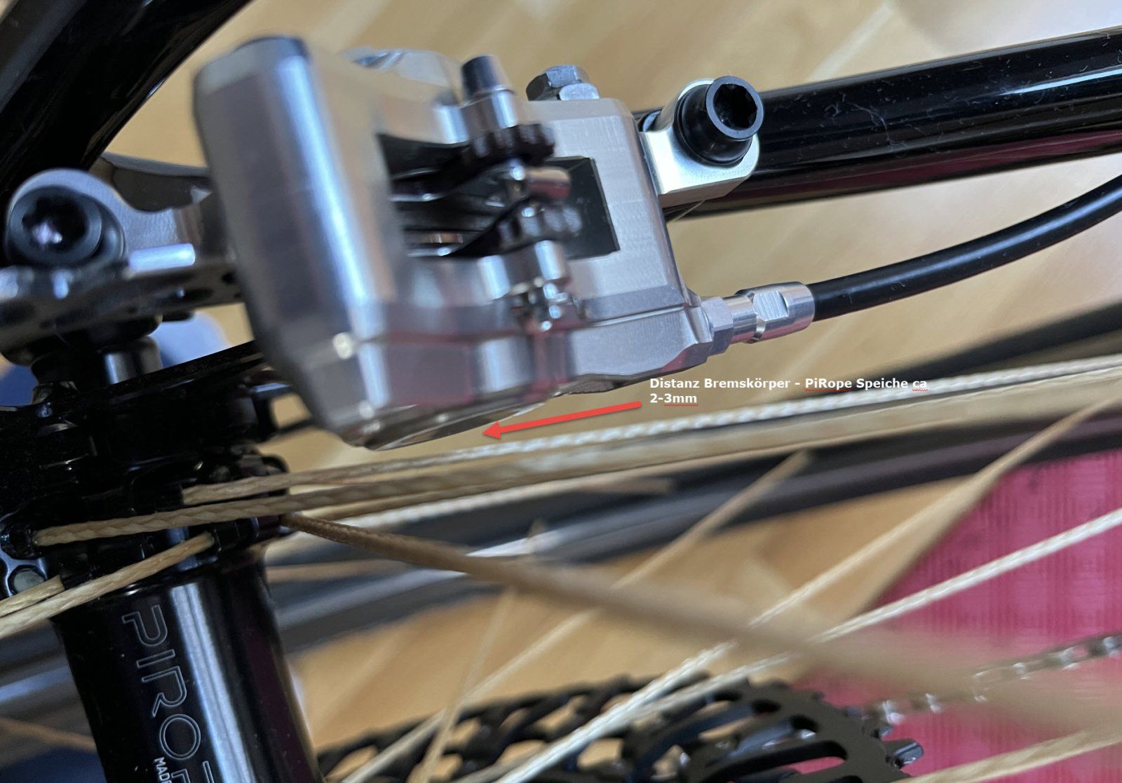 Außerdem laufen die PiRope Speichen an der Vorderbremse nur ca einen Millimeter (!) vom Bremskörper entfernt vorbei (würde sich etwas verbessern wenn ich die Scheibe mit Shims nach links verschiede da dann auch der Bremskörper etwas weiter nach links wandersn würde), hinten ist zwischen dem Bremskörper und den PiRopes ca. 3mm Spiel - ebenfalls sehr sehr wenig.