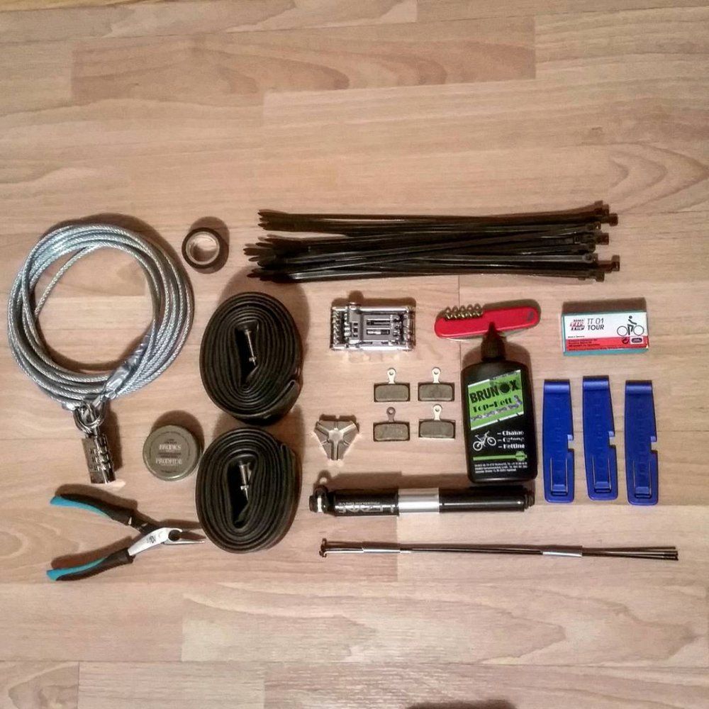 - 2× spare tubes - tire levers - multi tool - knive - pump - pliers - wired band (multi use purpose) - zip ties - tape - spare break pads - spokes - chain lube - patch kit - spokes wrench