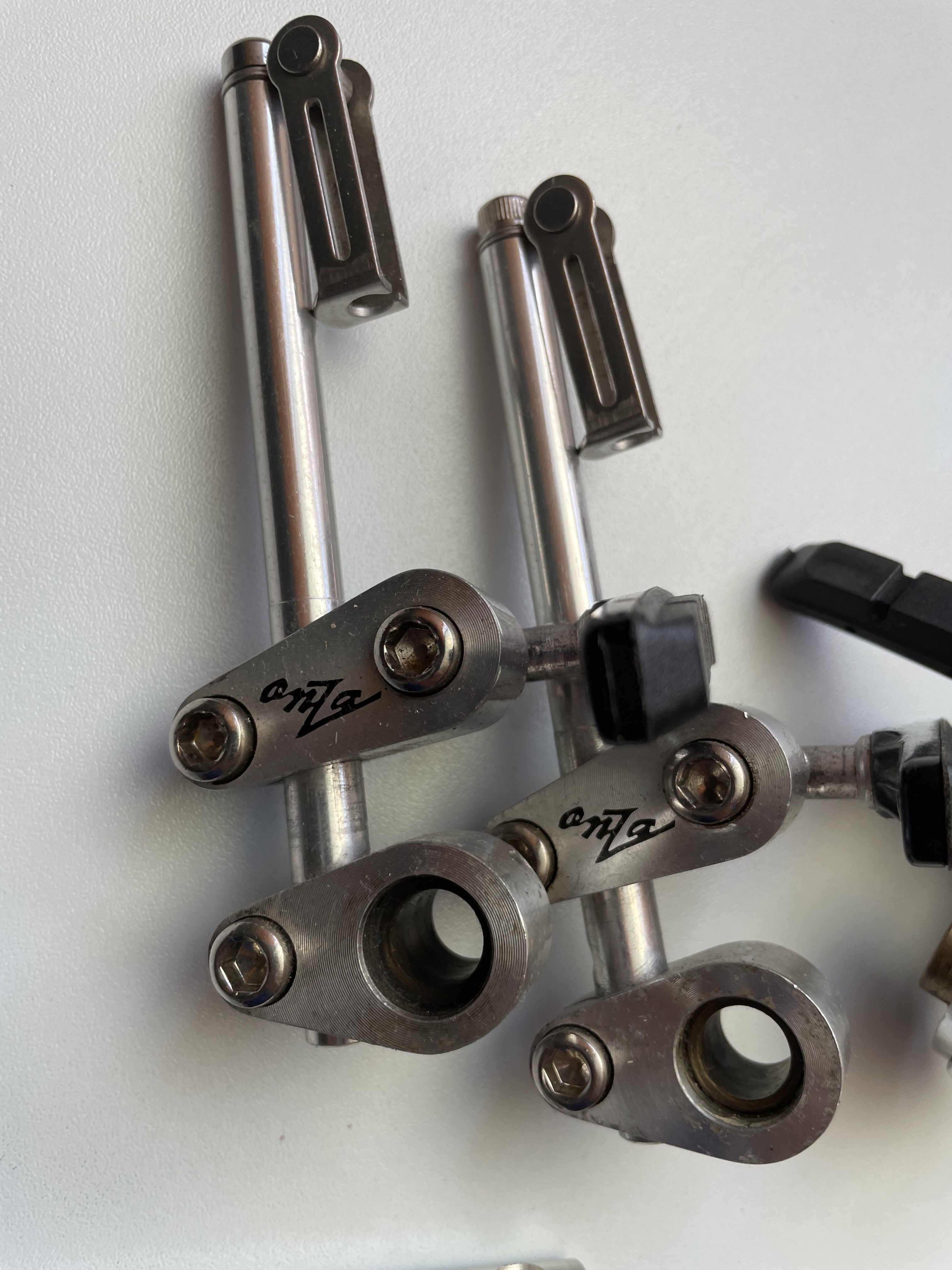 For sale a set of Onza HOLA brakes, front & rear. Good condition without cracks. Downside is a missing spring and a spring tension adjuster damaged but can be find here or on others Vintage MTB forums. Dust covers also cracked.