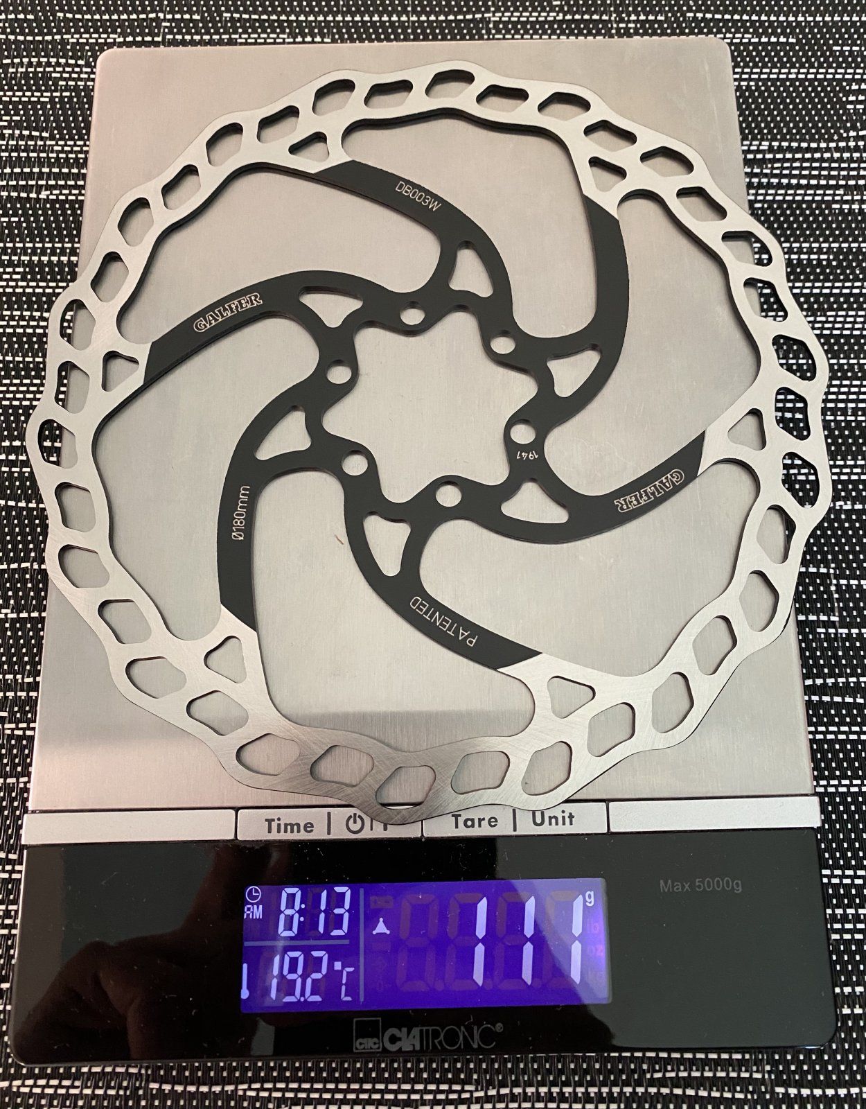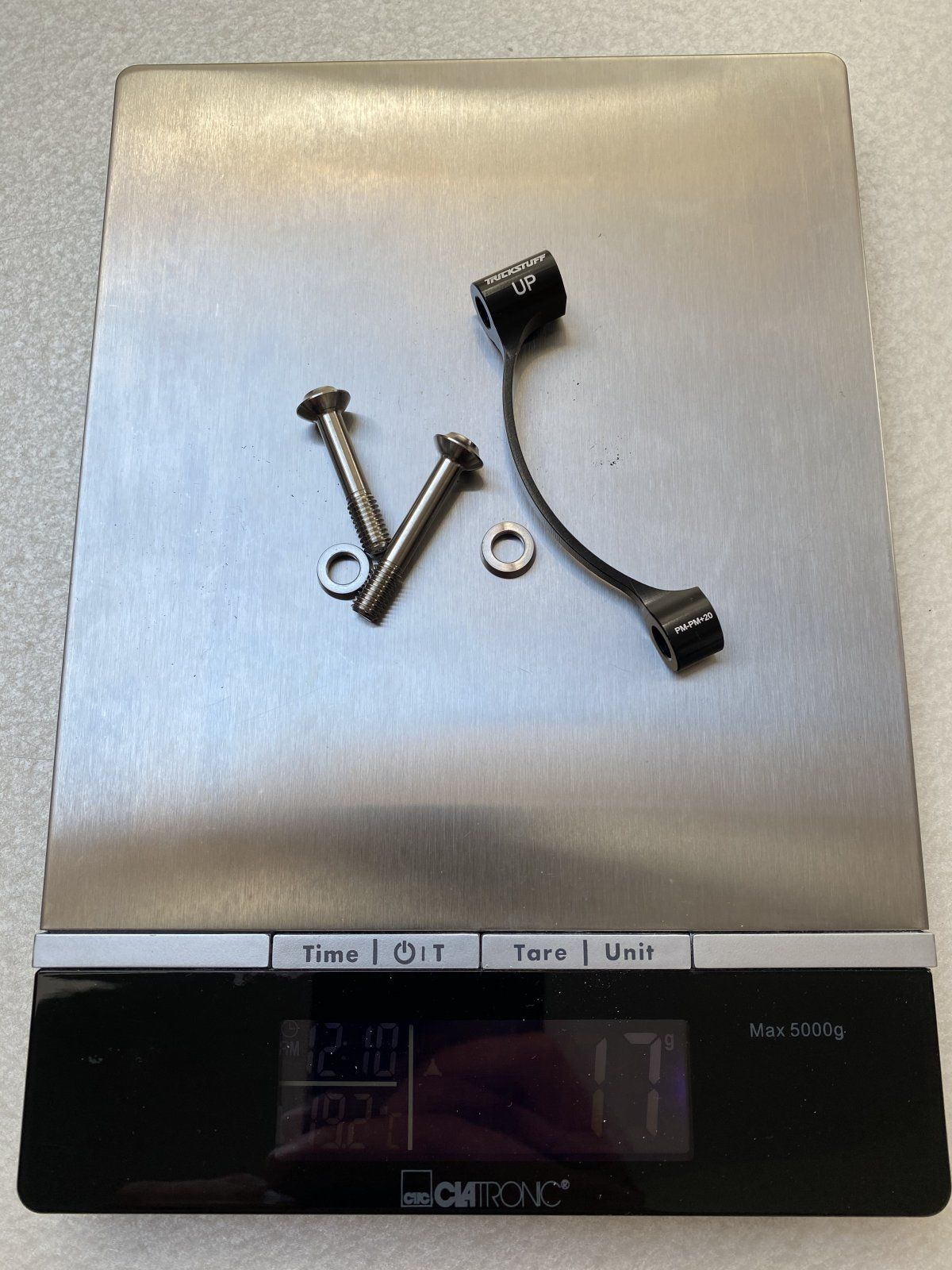Serie war XT, Umbau erfolgte auf XTR, Trickstuff Beta Leitung, Galfer, Trickstuff Power Plus, Extralite, Titanentlüftungsnippel, Titanschrauben für die Bremsscheiben. Ein PM Sattel wiegt ca. 80g, Ergeben errechnet derzeit ein Gewicht von ca. 385g mit schwereren Power Plus Belägen.