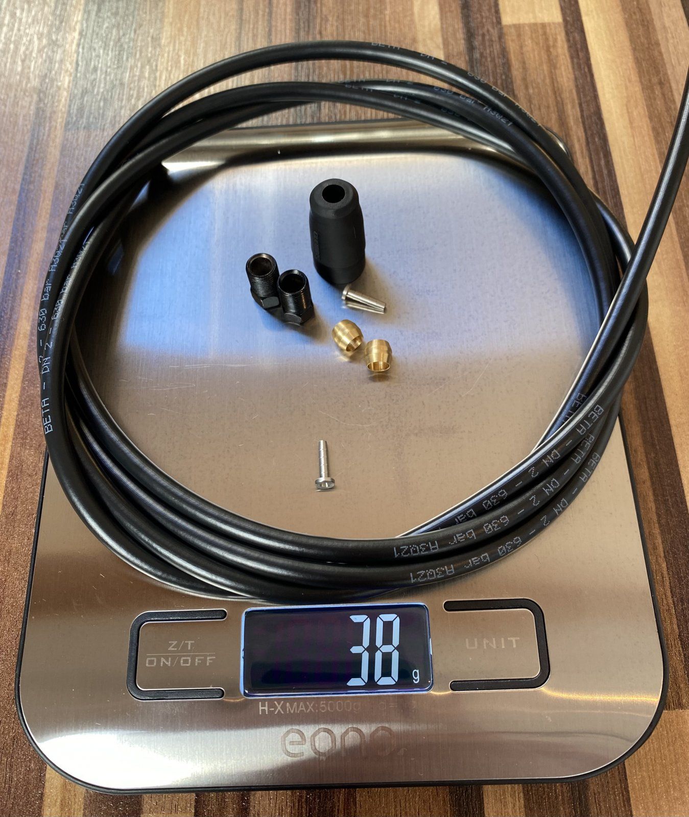 Der Schriftzug der Beta Leitung ist weit unauffälliger, lies sich entfernen und die Leitung passt vom Farbton gut zu der Jagwire Hülle.