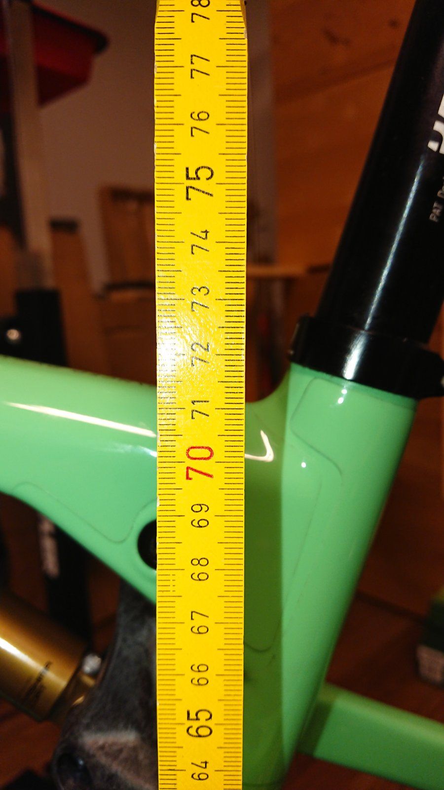 Hab noch mal genauer nachgemessen. Habe auch Schrittlaenge 75. Kann locker im Rad stehen. Wenn ich mich aufs Oberrohr setze dann sind die Beine schon ganz ordentlich angewinkelt. Anbei ein paar Bilder und die tatsächlich gemessene Hoehe ab Boden.
