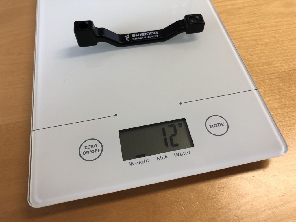 Laut r2-bike.de (von denen stammt das Bild) wiegt dieser Adapter 7g (ohne Schrauben). In der Länge passende Titan-Schrauben muss ich noch finden - bei titaniumplanet.com bin ich leider nicht fündig geworden.