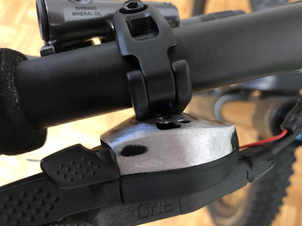 Befestigt ist der Remote an der unbearbeiteten Originalschelle der Shimano M9100 mittels einer 40mm M4 Schraube und einem leicht bearbeiteten Nutenstein (Provisorium):