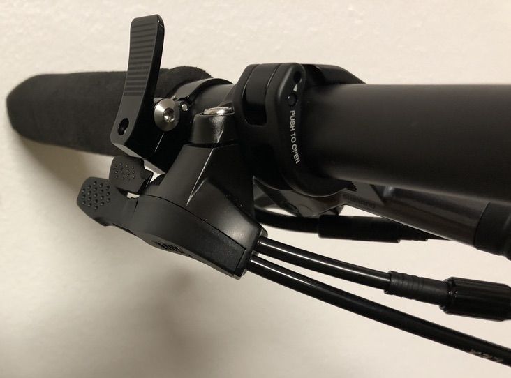Den serienmäßigen Vario-Remote-Hebel habe ich "umgekehrt" montiert - ist so für mich ergonomischer. Die Optik finde ich ebenfalls absolut ok - jedenfalls denke ich nicht, dass der Twinloc hier sehr viel oder überhaupt besser aussieht. Ziel wäre natürlich links und rechts nur eine Schelle (die der XTR M9100 Bremse) zu haben.