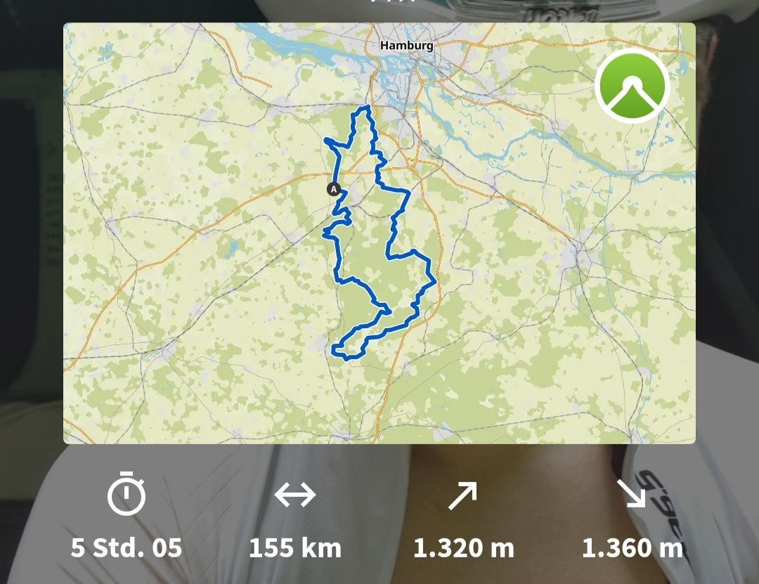 Ich denke, dass im Race Mode die Strecke in 6:30 Stunden machbar ist. Ich bin knapp 7:50 gefahren, 8:30 gesamt. Hamburg bremst einen ziemlich aus und ich hatte ein Problem mit meiner Kette.