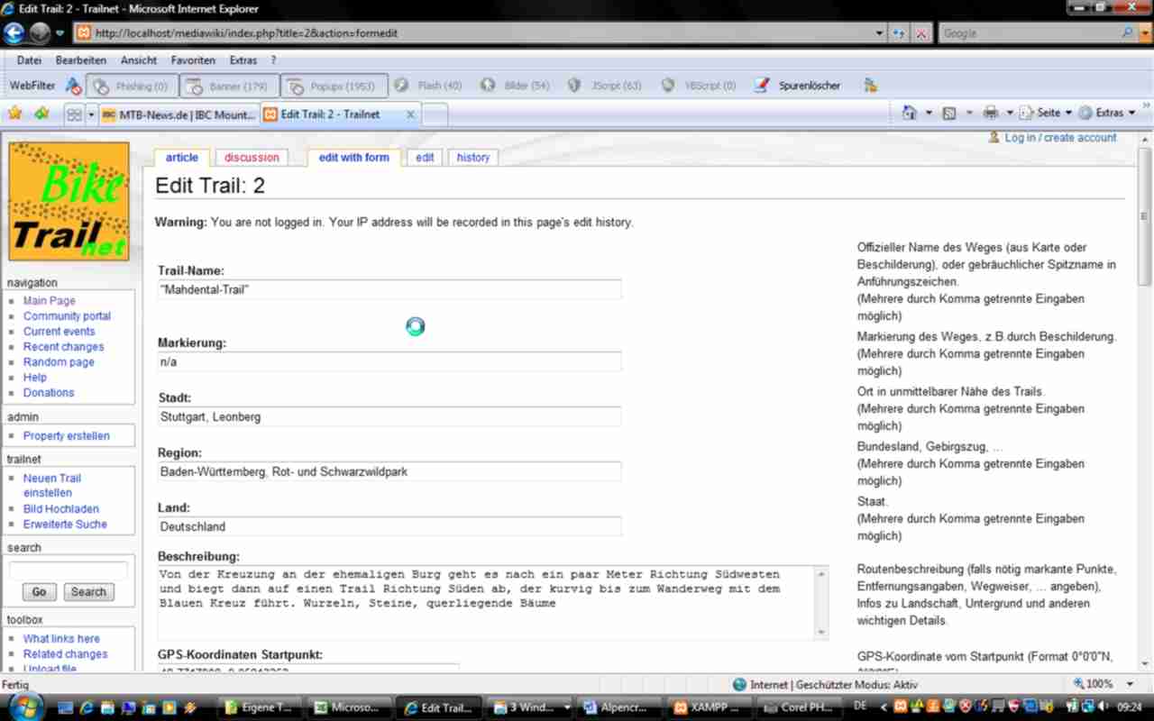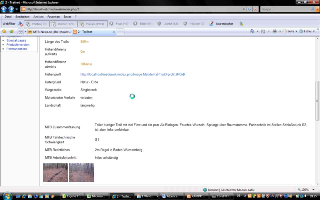 ich mache mir seit längerem Gedanken über eine Traildatenbank auf Wikibasis (eine erste Struktur habe ich in Mediawiki mit Semantic Mediawiki und Semantic Forms schon mal lokal bei mir auf dem Rechner, weiter bin ich noch nicht gekommen), und bin jetzt zufällig über diesen Thread gestolpert.