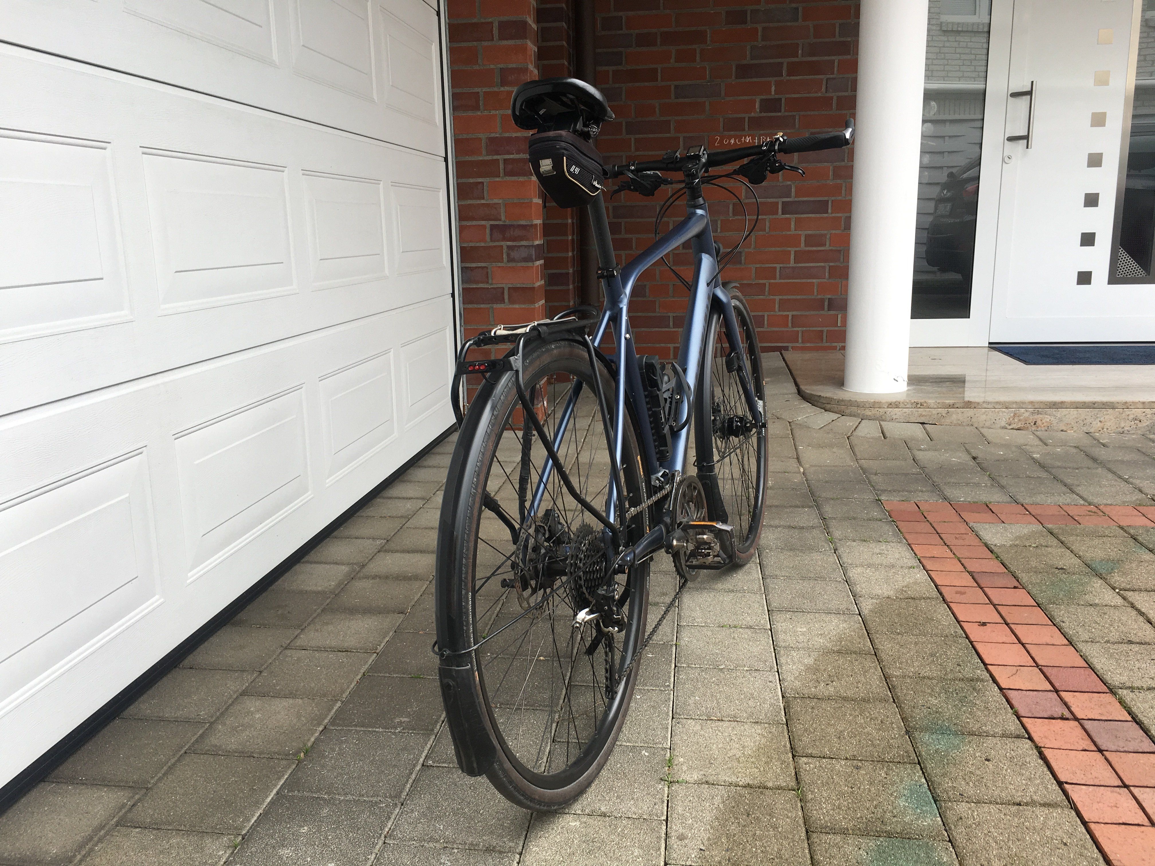 Das ist mein Schotterpendelrad in der Schlechtwetterkonfiguration. Wie man am Unterrohr sehen kann ist das vordere Schutzblech zu kurz.