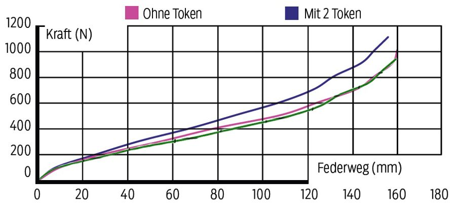 Was sagt uns das? Wer entweder Probleme damit hat, den gesamten Federweg zu nutzen, oder findet, dass die Gabel (im mittleren Bereich) zu viel Federweg freigibt/zu einfach durchsackt sollte keine Token verwenden, sondern eher die Luftkammer vergrößern.