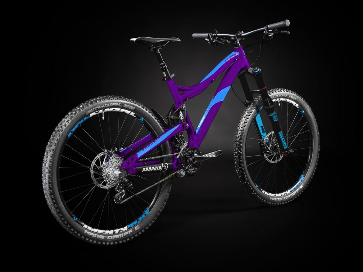 ich würde mir gerne das Tyee Flo kaufen. Könntest du mir bitte das Tyee Flo in lila mit türkis-blauen Decals gestalten? Im Internet bin ich auf ein Trek Session gestoßen, dass ziemlich genau meine gewünschte Farbkombi zeigt.