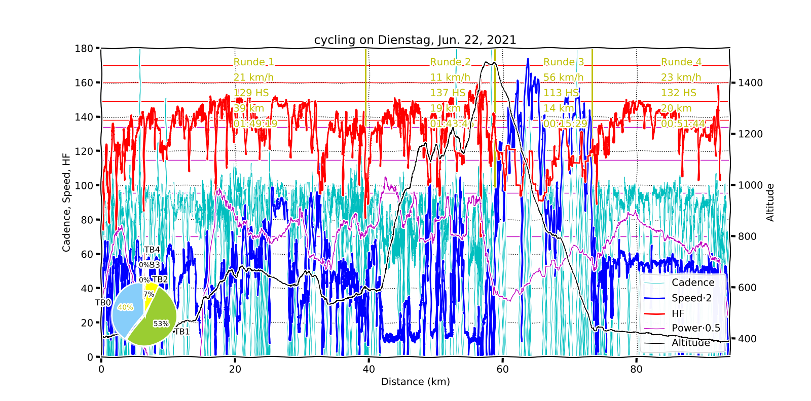 Ich habe mir ein Python Skript zum Auswerten von Fitfiles geschrieben. Nachdem es mittlerweile über 800 Zeilen hat, habe ich es mal veröffentlicht. Vielleicht interessierts ja zumindest einen, dann wäre die Arbeit nicht ganz so verschwendet. Der Clou ist, nebst buten Grafiken, dass eine Zeile für eine Libre Office Calc Tabelle generiert wird (man kann notfalls auch Excel nehmen ;-), die man dann reinkopiert und somit alle Möglichkeiten, die Tabellenkalkulation so bietet, hat. Kilometerstände werden soweit möglich, ausgelesen, man hat also alle Möglichkeiten in der Tabelle, km-Stände vom Material um Auge zu behalten. Das ganze ist für 4 Räder + Leihrad + Stadtrad konzipiert, kann sich ja jeder nach Bedürfnissen anpassen. Unter Windows hab ichs schon lange nicht mehr getestet, wüsste nicht, warums nicht gehen sollte. Getestet ist es für Bryton Rider 310, 530, 450, IGPSport 620, SRM PC8, Gamin (irgend ein 10xx). Da gibts ein paar Feinheiten, wie z.B. schreiben die einen 0 in nicht verwendete Werte, wenn man etwa kein Powermeter hat, bei Garmin widerum es es "None". Kann also sein, dass da und dort noch was nicht ganz funktioniert, aber ich kann halt nicht alle Konfigurationen der Welt testen. Sonst bitte "AS IS", WITHOUT WARRANTY..." ernst nehmen. Für Informatik-Akademiker gleich vorweg, der Stil des Codes ist auch so, wie er eben ist, man kann das sicher "schöner" schreiben, keine Frage. Aber es funktioniert in der Regel.