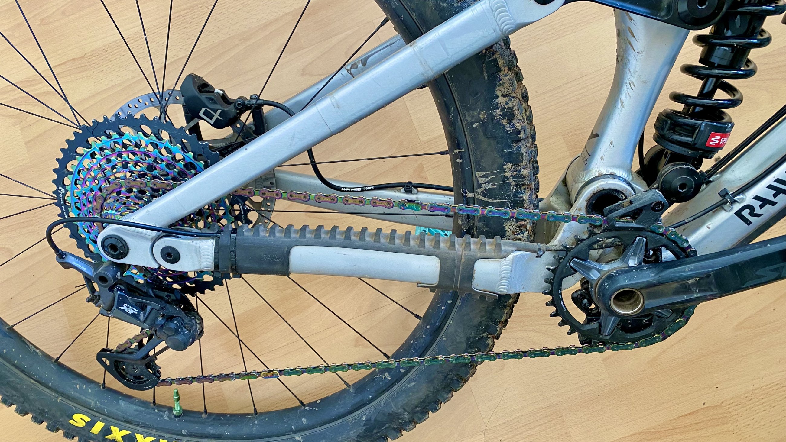 Kette ist gewachst und der Zustand auf dem Fotos ist nach 3 Monaten Winter ohne die Kette auch nur abzuwischen (kein Scherz). Die hartchromierte X01 Kette ist außerdem extrem langlebig, und im gewachsten Zustand bislang selbst bei zerofrictioncycling noch nicht an die Verschleißgrenze gekommen.