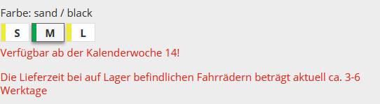 Ich habe hier ein paar Beiträge überflogen und scheinbar werden Räder erst verspätet ausgeliefert bzw. die Auslieferung verschoben. Beim Cragger 8 steht für Größe M aktuell, dass es auf Lager wäre und es gibt widersprüchliche Signale. Denn es wird bei allen Größen angegeben, dass es erst ab KW 14 verfügbar ist. Kann mir das jemand einordnen, ob das Rad nun auf Lager liegt und in wenigen Tagen kommt oder ob die angegebene KW gilt? Danke schonmal.