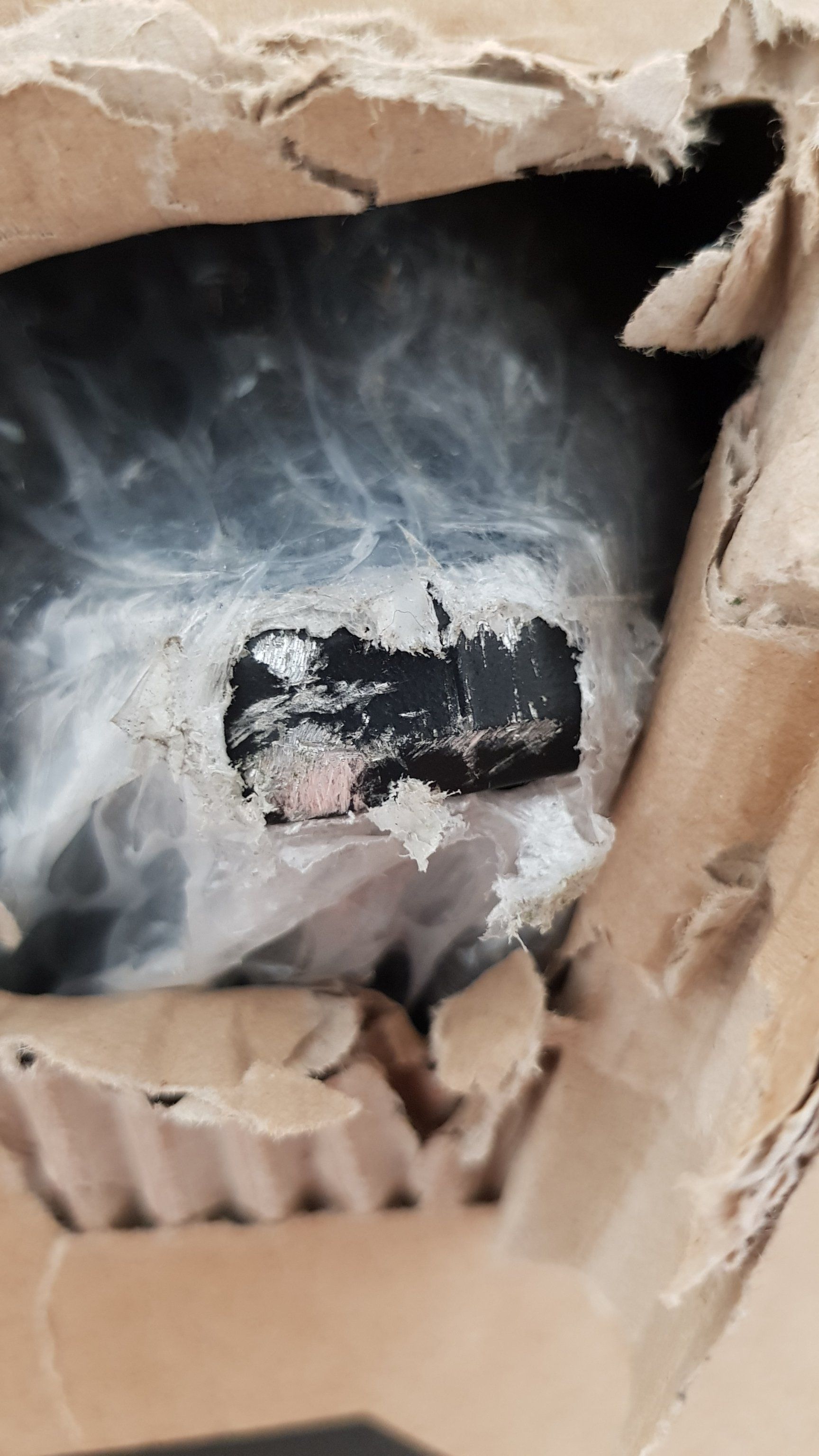Der Karton ist aber schon auf dem Rückweg, mit Schadensanzeige. Hätte da keine Hemmungen, einen Anwalt hinzuzuziehen, ich bin so was von unschuldig. Sieht man aber auch an dem Schaden, das sieht aus wie vom LKW gefallen und dann noch über die Straße geschleift. Und es war ja weiß Gott kein schweres Paket (13 kg), das konnte ich problemlos mit einer Hand hochheben.