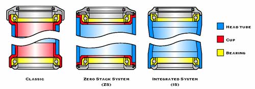 - zerostack: das steuerrohr hat einen größeren durchmesser, dadurch kann man die lagerschalen ins rohr einlassen (siehe bild). die länge des effektiven steuerrohrs bleibt fast gleich